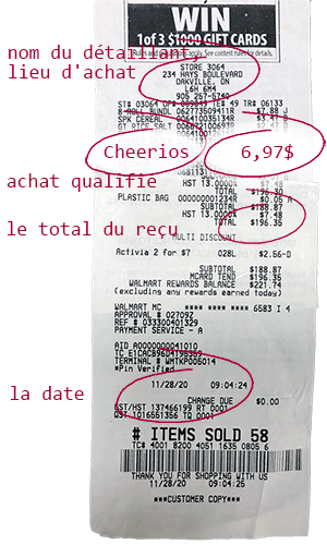 Prenez une photo (ou numérisez) de votre reçu original en entier montrant clairement votre achat admissible (incluant le montant de l’achat) ainsi que la date, le nom du détaillant, l’emplacement de l’achat et le total du reçu. La photo ou le fichier à téléverser doit être en format .JPG, .JPEG, .GIF, .PNG ou .PDF et ne doit pas dépasser 5 Mo.